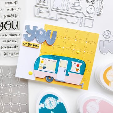 Inspired by tufted upholstery, the Tufted Cover Plate Die adds the look of stitching and buttons for a perfectly textured background. Cut it from CP Colored Cardstock or try ink blending for a beautiful ombre effect. This versatile die works on just about any card and pairs especially well with the retro campers in the Happy Trail-ers Stamp Set.