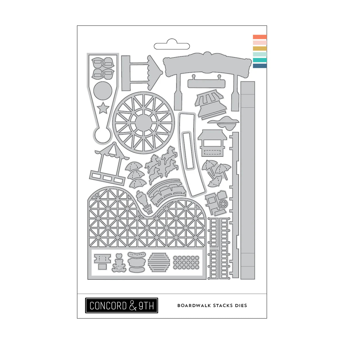 Step right up, the Boardwalk Stacks Dies hold the ticket to your next crafty adventure! This wildly fun die set brings all the magic of a carnival to your cards and other projects with detailed pieces to create roller coasters, ferris wheels, carousels, snack stands, game booths, and more. Piece them together on a traditional card front or really make them stand out with the Pop-Out Stacks Base Dies. Coordinates with the Boardwalk Stacks Stamp Set. 29 pieces.