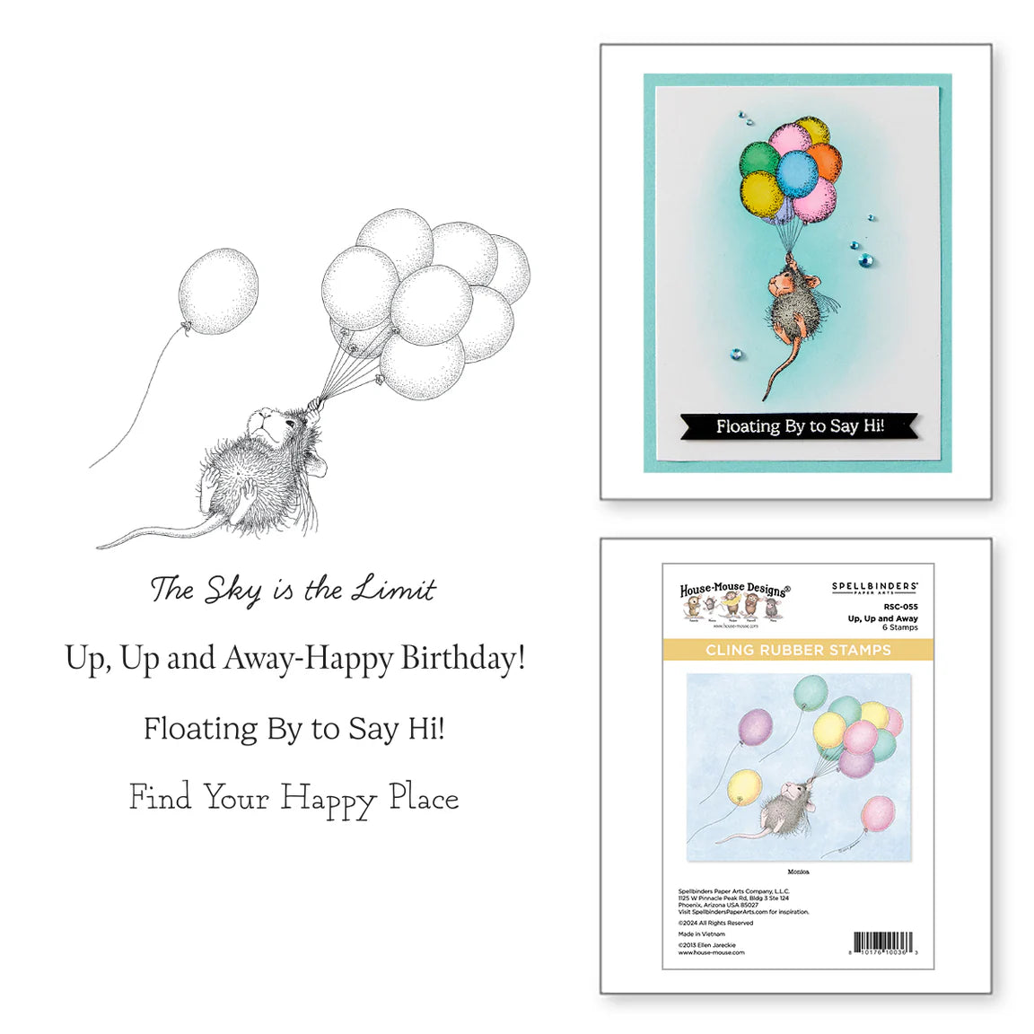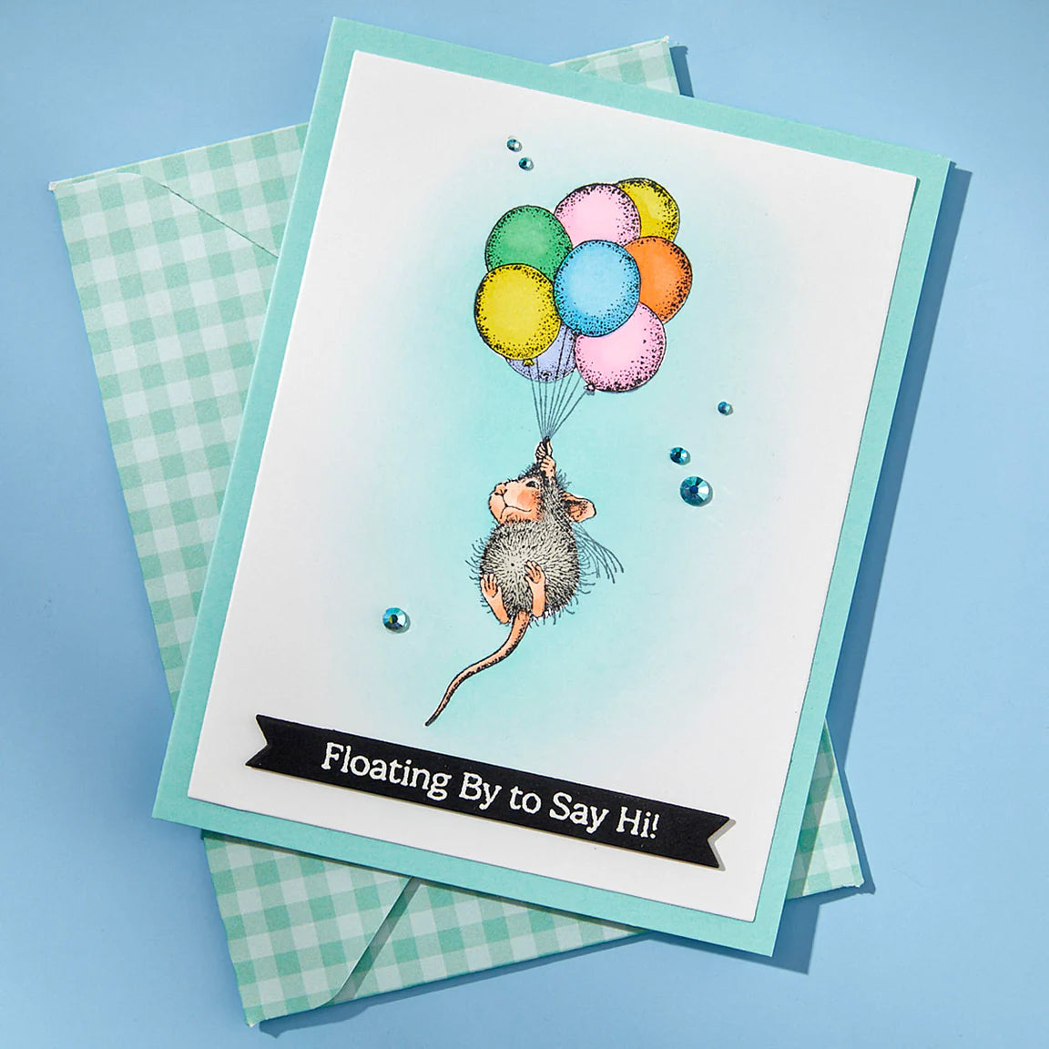 Up, Up and Away Cling Rubber Stamp Set is part of the House-Mouse Rare Bloom Collection. Monica is flying off to another adventure with a cluster of eight balloons! In addition to the focal image, the set of six stamps includes one balloon accent and four sentiments: Up, Up and Away – Happy Birthday, Find Your Happy Place, Floating by to Say Hi, and The Sky is the Limit. Designed to be used with a stamp acrylic block.