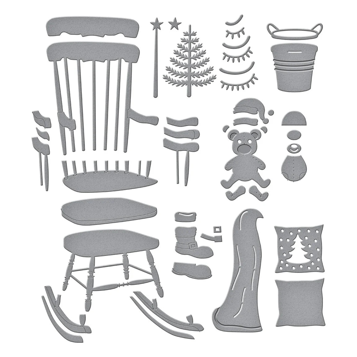 Christmas Rocking Chair Etched Dies are from the Country Christmas Collection by Annie Williams. Add a warm rocking chair to your project with this set of 26 thin metal cutting dies…a perfect cozy vibe for any holiday creation. With many accessories, you can customize your look!