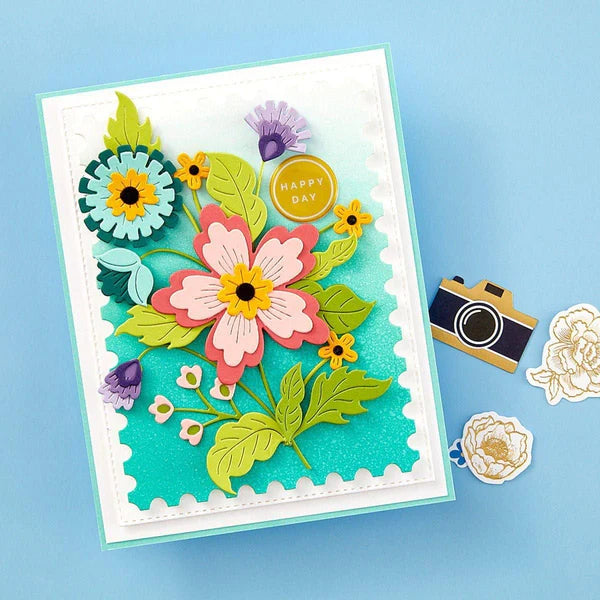 The Nested Postage Labels & Tag Etched Dies from the Bayfair Collection is a set of 11 thin metal nesting dies for creating postage stamp designs in a variety of sizes. The fun scalloped edges of these rectangular dies add interest and dimension for frames, background pieces, shaped cards and more! With sizes ranging from A2 (4.25 x 5.5 in) all the way down to actual postage stamp size (.62 x .73 in), these dies are extra versatile!