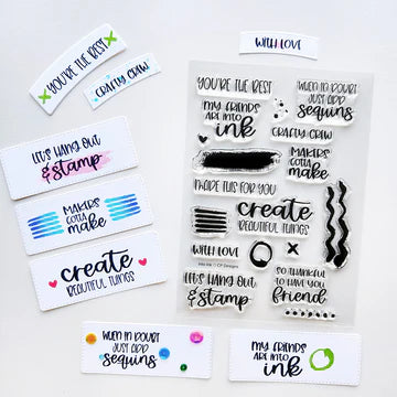Inspired by an early CP stamp set, this sentiment set is perfect for anyone who is truly Into Inks! It features fun sentiments to celebrate your stamp-loving friends. The set also includes inky lines, swatches, and squiggles—perfect for adding playful accents to cards and projects. Makers gotta make!