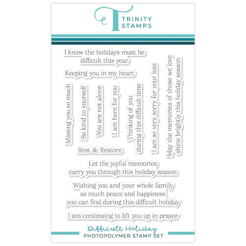 Discovering the perfect expression for trying times during a holiday can be challenging. This 4x6 stamp set provides 13 different sentiments of encouragement to remind someone that you are thinking of them in a difficult holiday period.